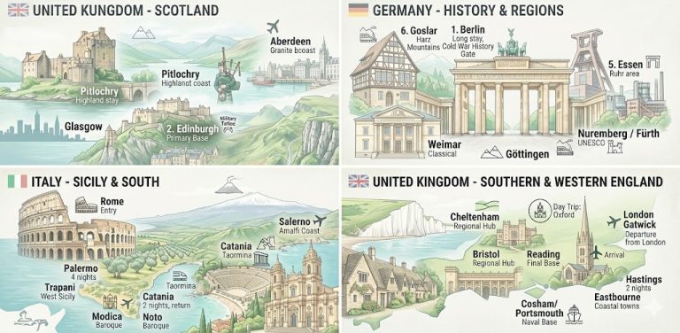 這趟秋季旅行橫跨英國、德國與義大利,為期兩個多月,從冷戰歷史現場到地中海海岸線,完整記錄跨國長距離移動與行程規劃想法,包含路線安排與交通規劃。