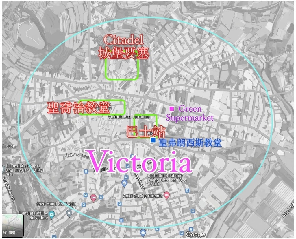 下圖是我們住宿周圍的環境。這裡離聖喬治廣場其實不遠,Victoria 的市區本就不大,舊城區更是迷你,巷道彎彎繞繞,一開始認路還真需要一點時間。不過,這種由土黃色石材、狹窄小巷串起來的城市樣貌,讓人意外感受到一點摩洛哥北非的氛圍,是我對 Victoria 最初也最深刻的印象之一。