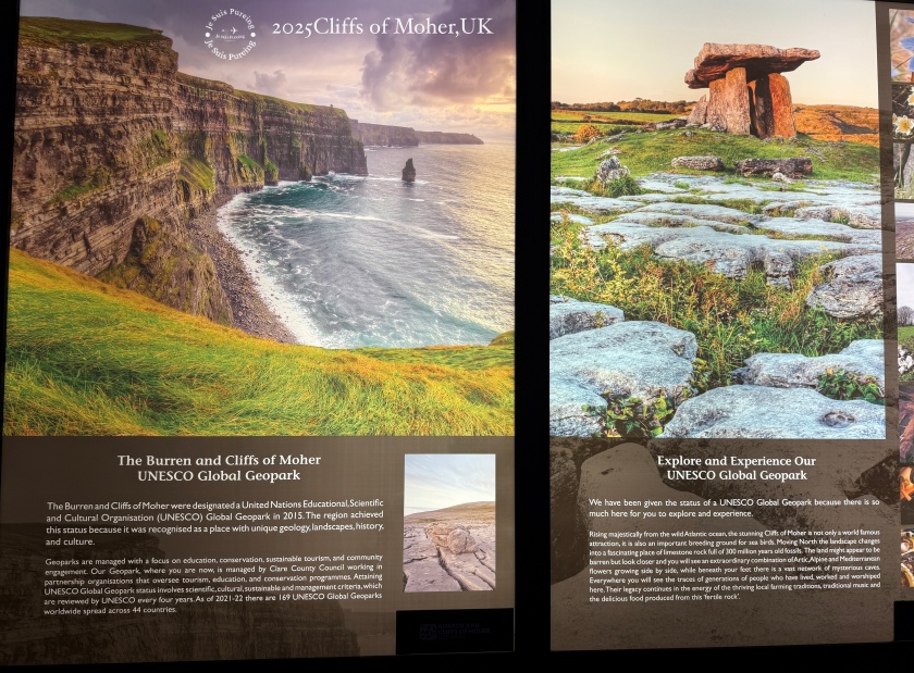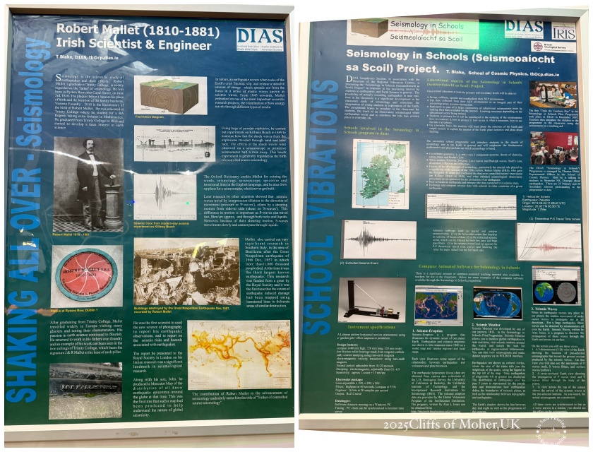 這區展示的是愛爾蘭地震學研究,被譽為「現代地震學之父」的都柏林科學家 Robert Mallet,他在十九世紀中期首次以爆破實驗研究地震波傳遞,開啟了現代地震學的起點。旁邊則是由都柏林高等研究院推動的 「Seismology in Schools」 計畫,讓學校安裝地震儀器,學生能即時觀測全球地震活動。這些展示讓人了解莫赫懸崖不只是自然奇景,也是一個連結地球科學與教育的場所。