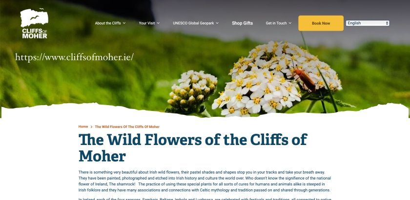 常見野花包括:Sheep’s-bit(藍鈴花)、Birds-foot-trefoil(黃花草)、Sea Campion(海石竹)、Thrift(海薰衣草)、Yarrow(蓍草)。這些野花以柔和的色調、抗風耐鹽的特性聞名,構成莫赫懸崖草坡的獨特色彩,也承載古老的凱爾特節慶傳統與民間信仰。