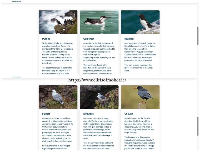 參考資訊:https://www.discoverireland.ie/clare/birdwatching-at-the-cliffs-of-moher、https://www.cliffsofmoher.ie/unesco-global-geopark/conservation/nature/