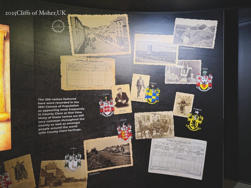 在莫赫懸崖的遊客中心,有一面展牆特別介紹克萊爾郡(County Clare)的家族姓氏。牆上展示了根據 1901 年人口普查 所統計的 250 個最常見姓氏,並附上各家族的紋章、老照片與文件。這些名字至今仍能在愛爾蘭各地、甚至遠在海外的克萊爾移民後代之間找到。