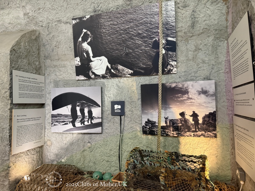 這個展區以「生存」為主題,講述了莫赫懸崖地區居民如何在強風、貧瘠土地與險峻海岸間,憑著毅力與智慧生活下來。牆上以黑白照片與口述紀錄,呈現出早期農民、捕鳥人與漁民的艱辛日常。