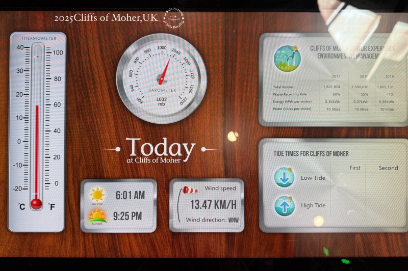 這個裝置是莫赫懸崖遊客中心的即時氣象與環境資訊面板,畫面中顯示了當地當天的天氣狀況,包括氣溫、氣壓、風速與風向,以及日出與日落時間,讓遊客能掌握最佳參觀時段。