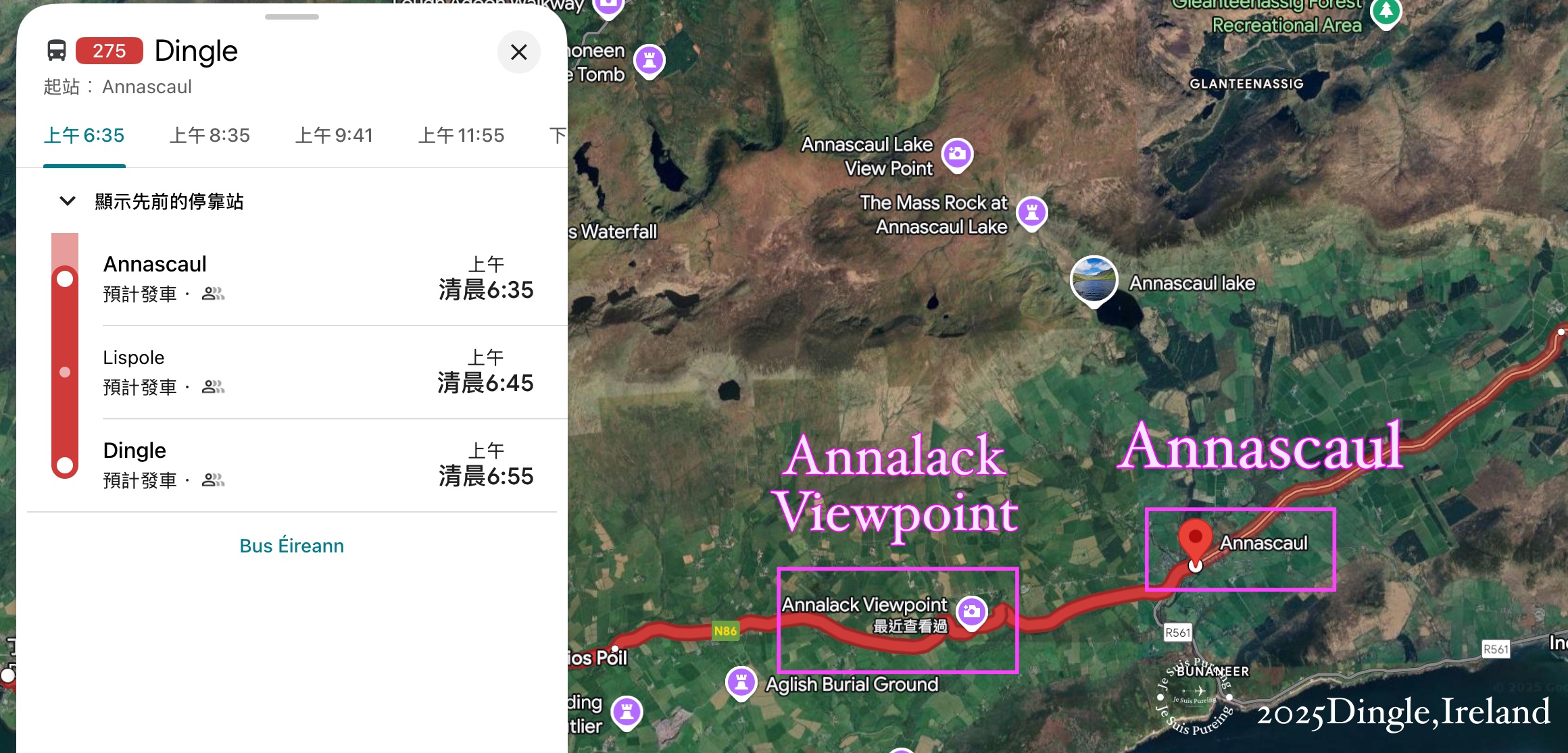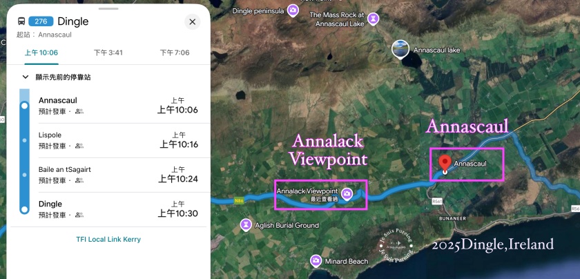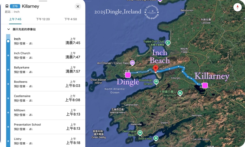 276路線班行駛 Killarney 和 Dingle 之間,班次少,每日僅有三班。車班時刻表:車班時刻表:https://www.locallinkkerry.ie/Dingle/#route276