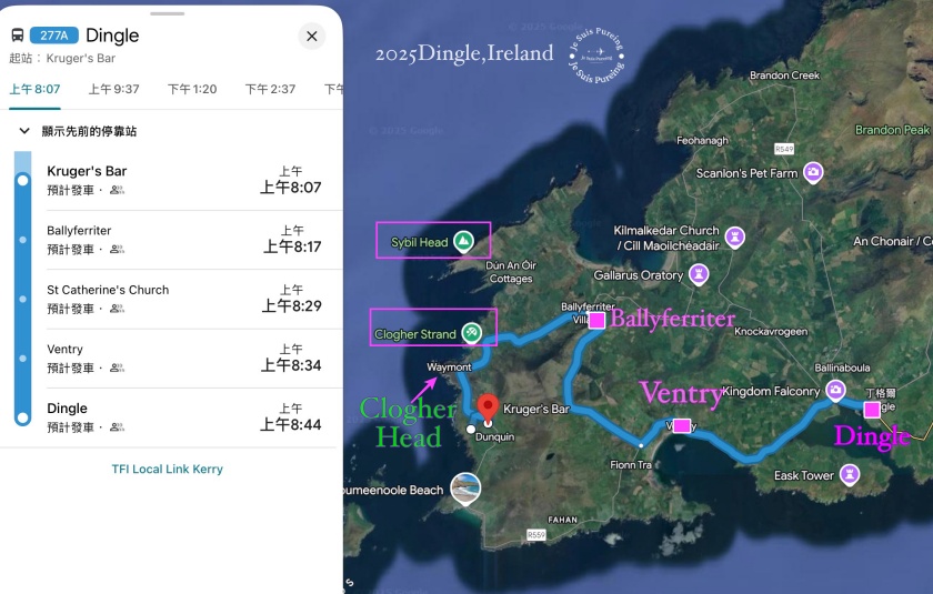 不過,為了讓和我一樣不想自駕、又不想錯過這片美景的旅人能有參考,我特地查了關於公共交通與巴士路線的相關資訊,整理在這篇文章中。至於 Dingle 鎮本身的介紹,我會另外寫成一篇遊記,而這篇則專注於 「Dingle 半島海岸沿線的景點」,沿著海岸線公路 Slea Head Drive,一站一站欣賞這條被譽為「歐洲最美海岸公路」的壯麗風景。