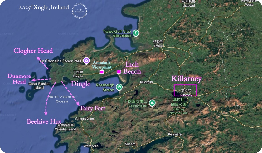 原本這趟旅程,我計畫參加的是 From Killarney: Ring of Kerry & Skellig Ring Full-Day Tour,卻在出發前十多天臨時被取消。當下又立刻又報名了另一個 Ring of Kerry Guided Day Tour,但就在出發前一晚,意外發現網站上竟然有 From Killarney: Dingle and Slea Head Peninsula Day Tour!因為一直很嚮往 Dingle 半島與北大西洋海灣的景色,雖然來不及取消原有行程,還是忍不住「再加碼」報名,花了雙倍的費用,為的就是不想錯過這片夢寐以求的海岸線。