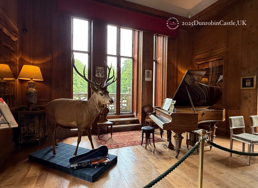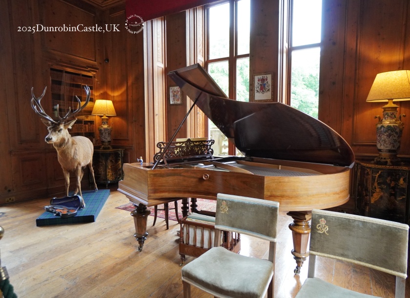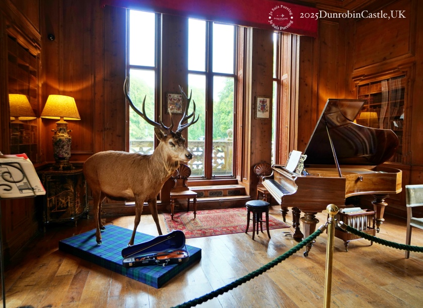 這個房間通常也被稱作「Drawing Room」或「Morning Room」。房間以溫暖的木質牆面與大型落地窗為主調,窗外可見花園與海岸景觀。中央擺放一架鋼琴,象徵薩瑟蘭家族對音樂與藝術的喜愛。角落陳列著紅鹿標本與小提琴盒,呼應城堡位於高地的狩獵傳統與貴族生活氣息。