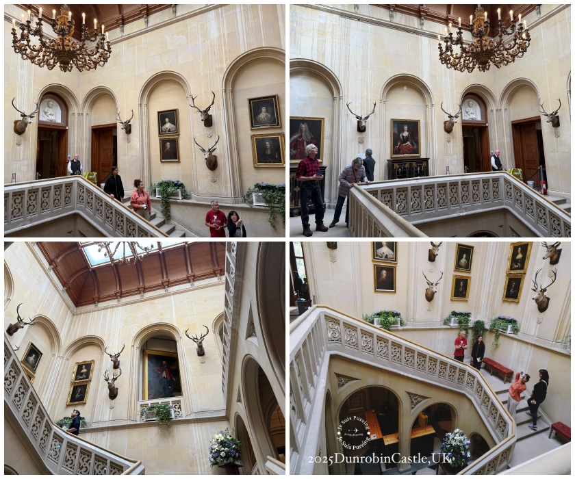 這座樓梯採用石質結構與開放式中庭設計,天井引入自然光,使空間明亮而典雅。牆上懸掛著薩瑟蘭家族歷代肖像與鹿角標本,搭配木質吊燈與拱形雕花欄杆,展現十九世紀貴族府邸的氣派格調,也是遊客進入城堡後最具視覺震撼的區域之一。