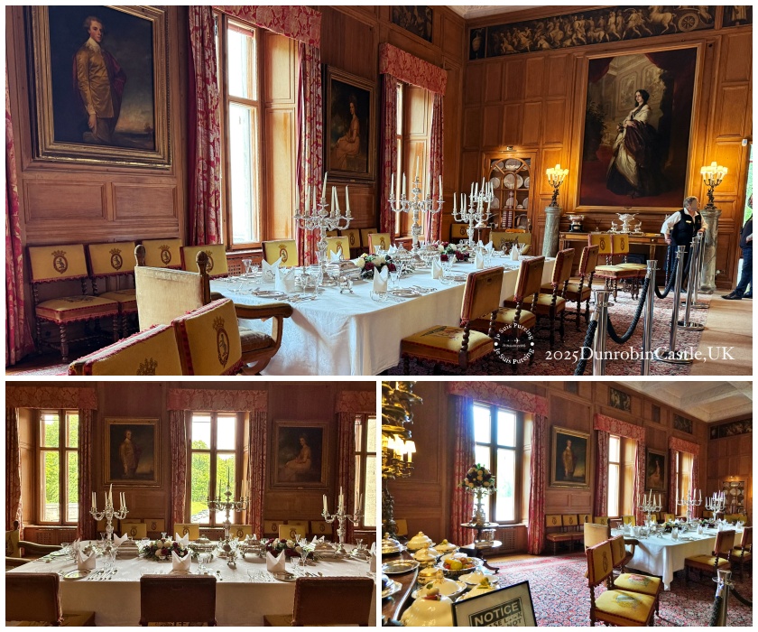 牆邊掛滿薩瑟蘭家族的肖像畫,而視線的焦點落在那張長餐桌上。餐椅為十七世紀的雅各賓式(Jacobean style)設計,椅套由公爵夫人 Eileen 在 1932 至 1939 年間親手刺繡,每張椅背都繡有不同的家族紋章,總共有 22 張。這樣的細節,不只是裝飾,更象徵家族的榮耀與傳承。