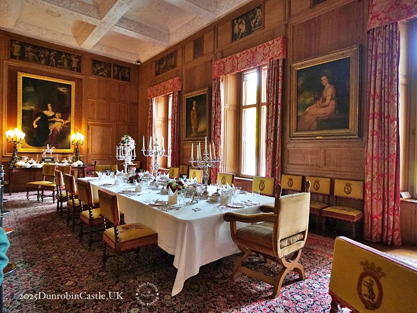 走進 Dunrobin Castle 的餐廳(The Dining Room),那份莊嚴與優雅立刻讓人屏息。高大的窗戶灑進自然光,映照在深色橡木牆面與華麗的燭台上,整個空間瀰漫著十九世紀貴族宅邸的氛圍。這間餐廳由蘇格蘭建築師 Sir Robert Lorimer 於二十世紀初重新設計,是第五代薩瑟蘭公爵在一次火災後委託修復的。Lorimer 以精緻的橡木雕飾與古典線條著稱,天花板的木作與牆頂的希臘式浮雕(Greek classical frieze),正是他典型的設計風格。