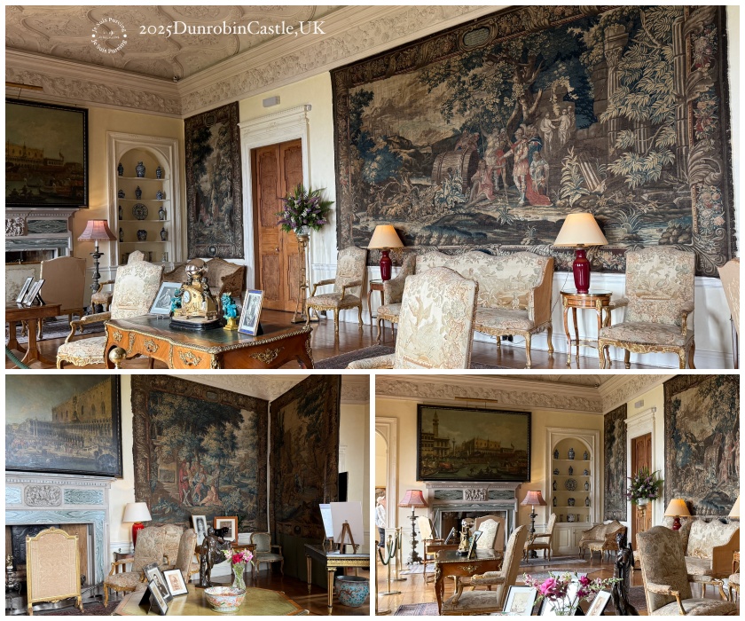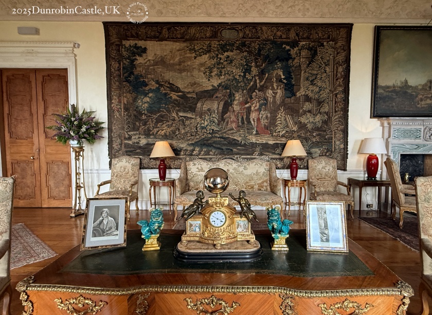 Dunrobin Castle 的畫室,也可稱為客廳或會客室,是一個充滿十八世紀優雅氣息的空間。主要家具屬於路易十五時期風格,包括兩組長椅與十二張雕花扶手椅。其中最引人注目的是一張路易十六時期法國桌,由義大利佛羅倫斯工匠 Joseph Baumhauer 於 1745 至 1772 年間製作,桌面鑲嵌華麗的皮耶特拉鑲嵌石工藝(Florentine pietra dura),展現精緻細膩的藝術品味。