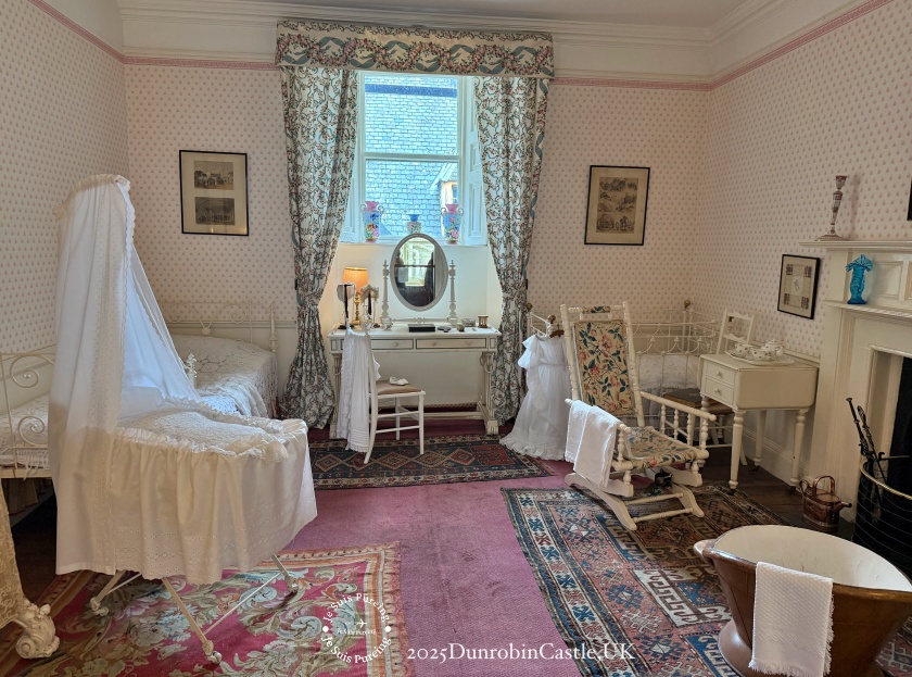 壁爐前擺放著小型的兒童浴盆,以及一個造型像澆花壺的熱水容器,正是當時為嬰兒準備洗澡時用來加熱與注水的器具。這些細節,真實反映了十九世紀初期貴族育兒生活的日常樣貌。房內一角可見白色蕾絲嬰兒罩與木製搖籃,搭配地毯與刺繡床單,顯得典雅細膩。