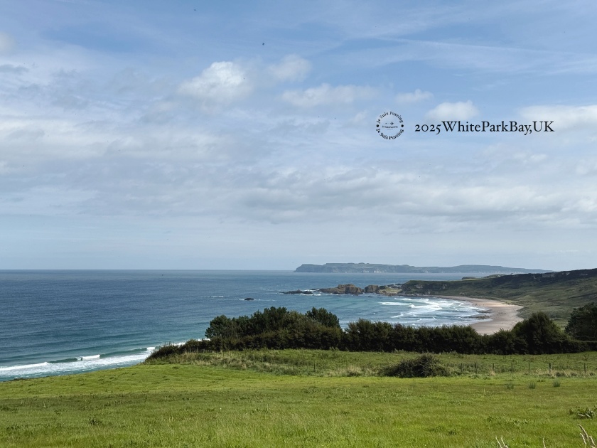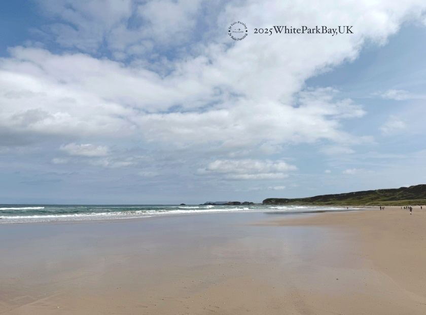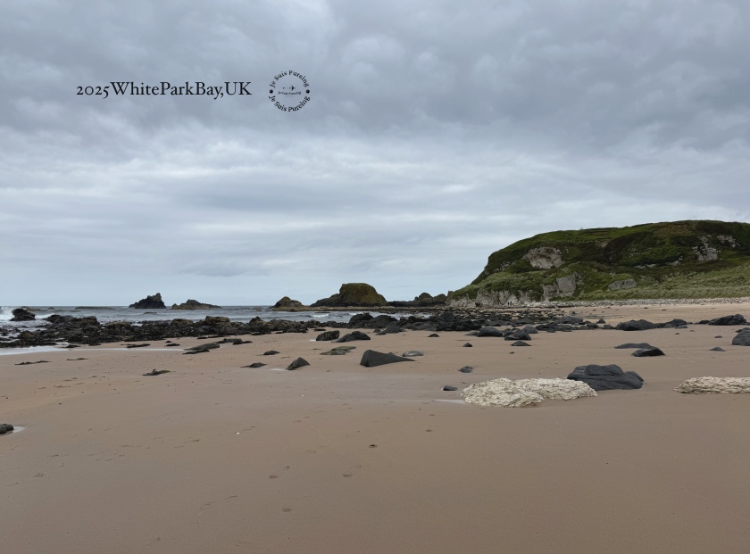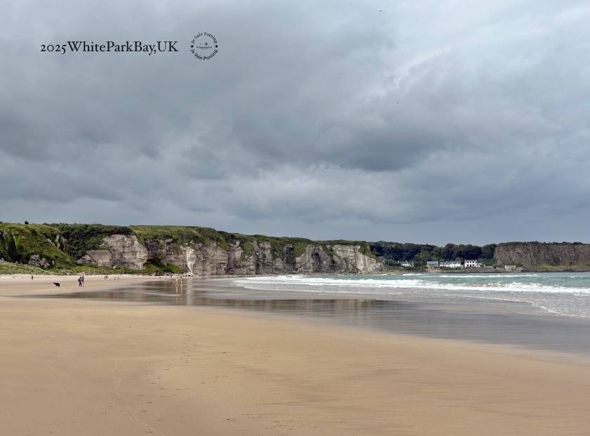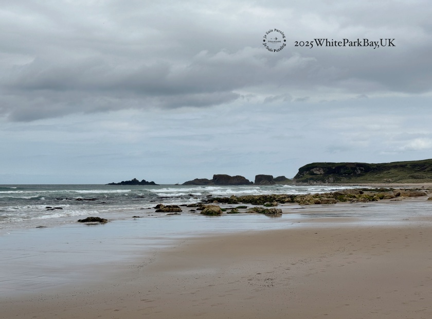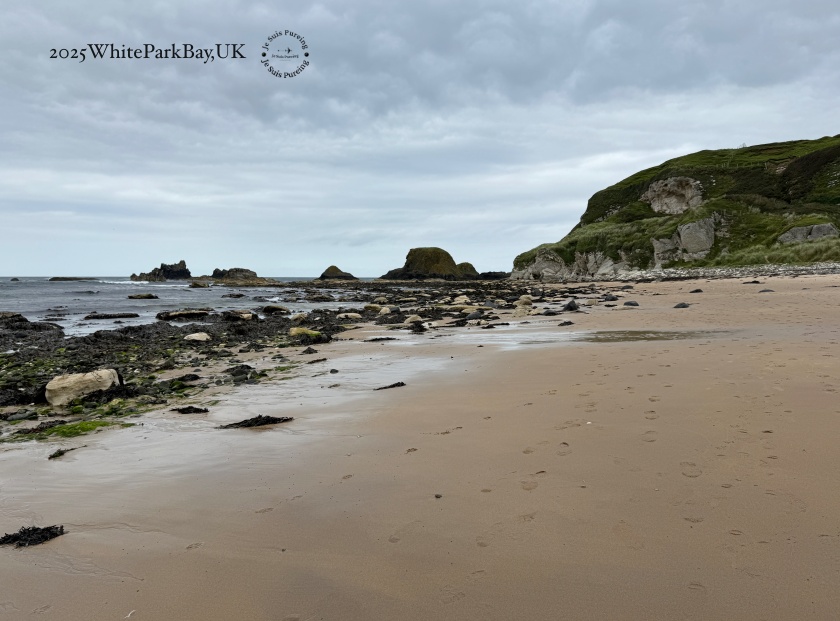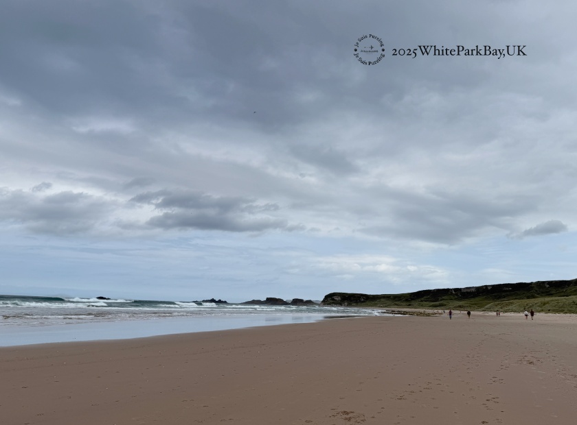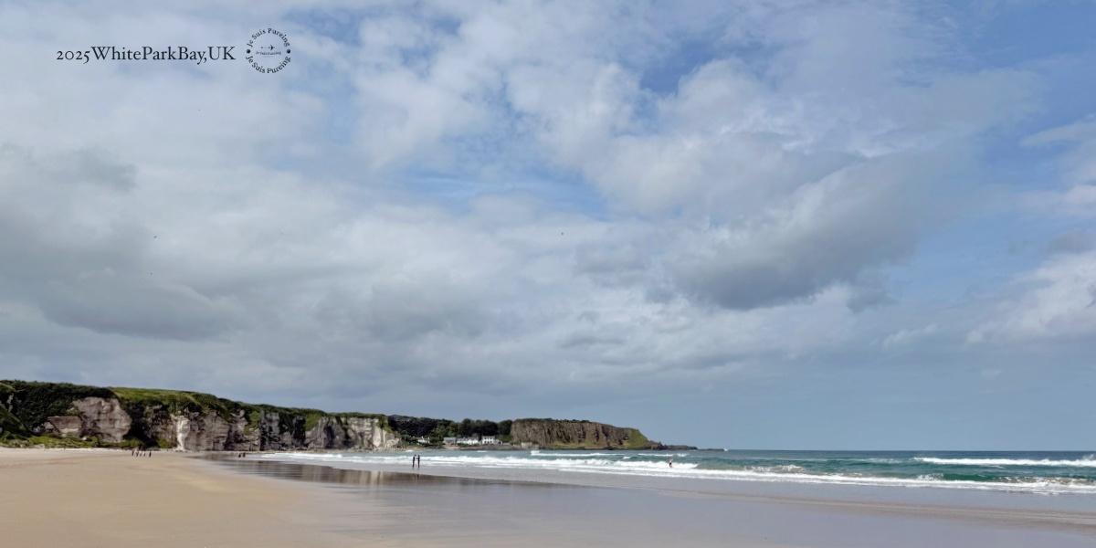 這次我選擇透過大眾運輸工具與健行的方式,一段段走向這片海岸的風景。而其中最令我印象深刻的,就是 White Park Bay。它不像巨人堤道那樣人潮洶湧,但卻擁有北愛最乾淨、最純粹的白沙灘。當我沿著草坡走下沙灘,海風輕柔地迎面吹來,眼前是一條優雅彎曲、看不見盡頭的海岸線。細白的沙彷彿替整個海灣覆上一層柔光,使這裡顯得特別寧靜而從容。天氣好的時候,那種自在舒適的氛圍,甚至會讓人忘記自己其實正站在北大西洋的岸邊。