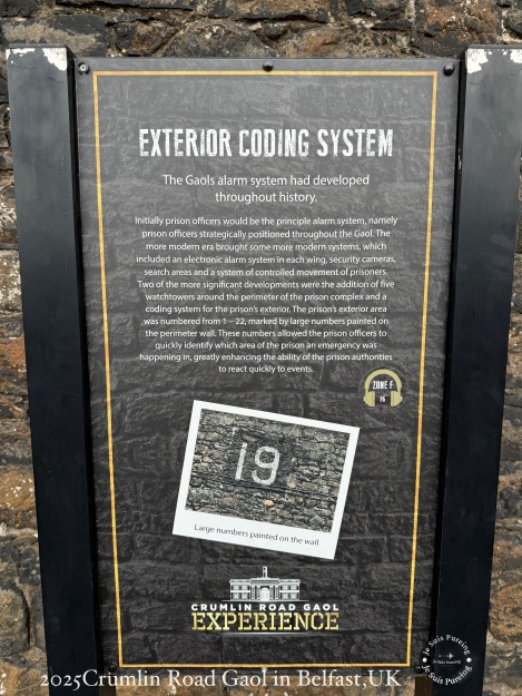 其中一項重要改變,是在監獄外牆與周邊設置五個瞭望哨,並在圍牆上標示編號。這些數字對應不同區域,一旦發生緊急狀況,獄方可以迅速判斷事件發生的位置,提高反應速度。照片中牆上的「19」便是其中一個區域編號——這些大型數字直接塗在外牆上,成為監獄管理體系的一部分。