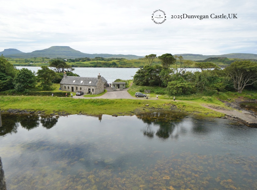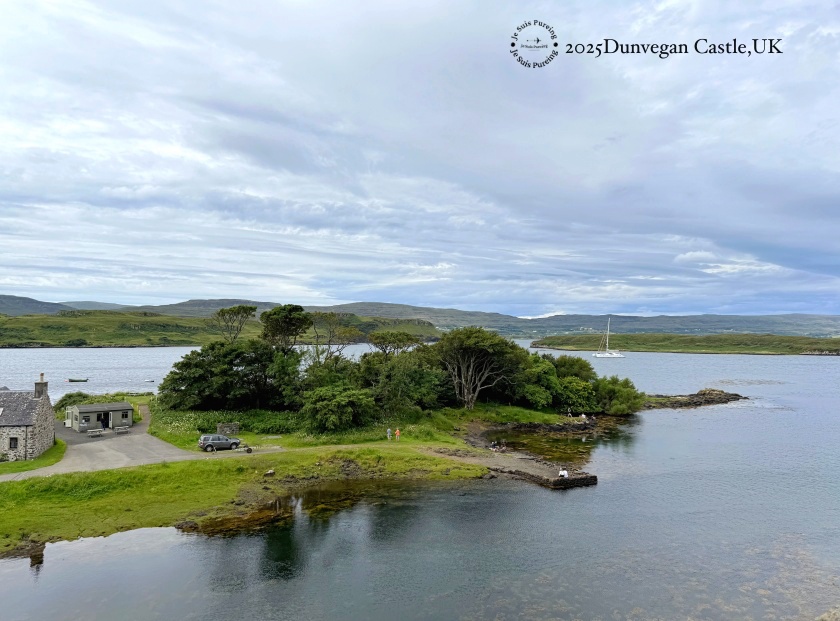 城堡內部參觀結束後,站在觀景平台向外眺望,可以清楚看出 Dunvegan Castle 得天獨厚的地理位置。城堡位於天空島西北側,緊鄰海灣型湖泊 Loch Dunvegan,視野開闊,山海景色在此交會。