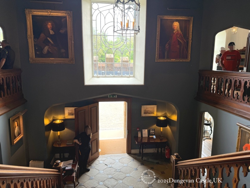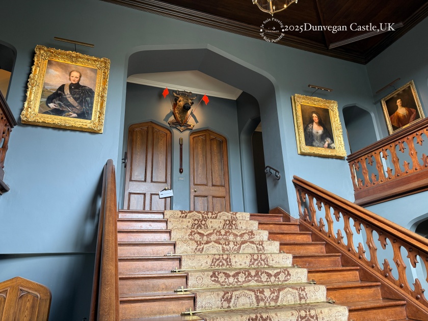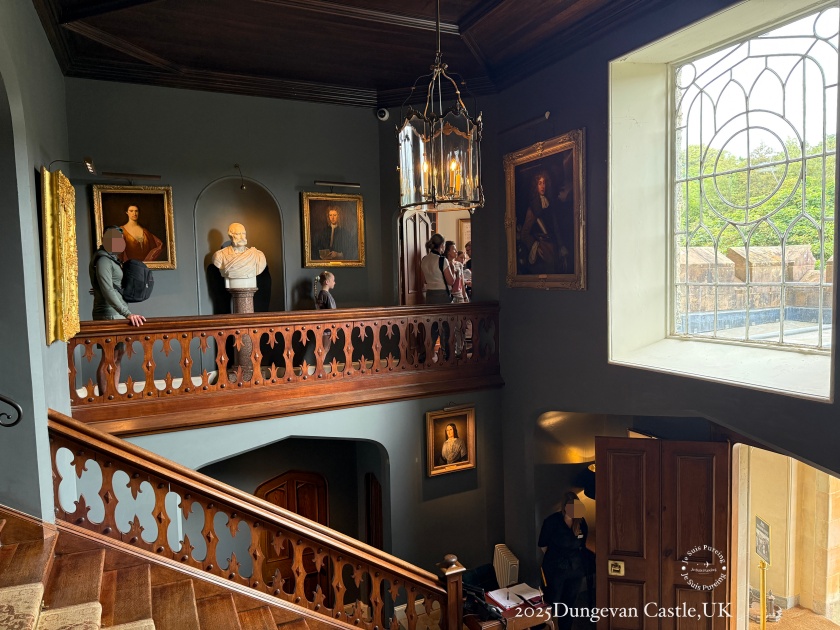 一走進城堡內部,首先映入眼簾的是挑高的大廳與寬闊的木質樓梯。深色木階搭配厚實的地毯。四周牆面漆成偏灰藍的色調,上面掛滿歷代麥克勞德家族成員的肖像畫,金色畫框在柔和光線下顯得格外莊重。