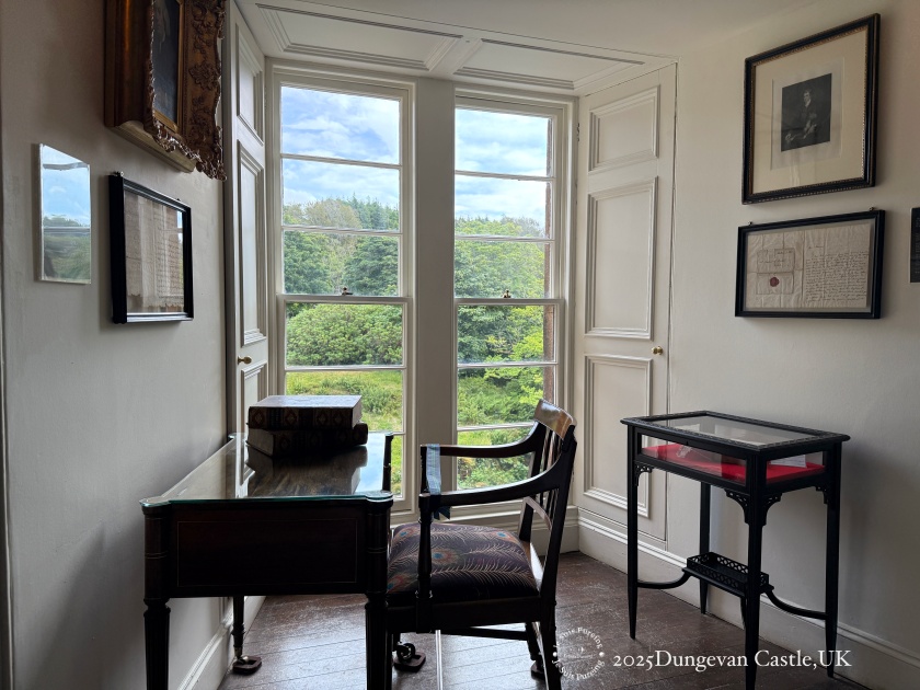 沿著樓梯上到二樓迴廊後,依照參觀動線從左側開始,牆面依序掛著氏族家族成員的肖像畫,旁邊還設有一座銀製餐具的玻璃展示櫃。牆上展示說明中提到,Dunvegan 城堡曾接待過多位重要文人。18 世紀時,英國作家 Samuel Johnson 與其友人 James Boswell 曾造訪此地,並留下珍貴的高地旅行記錄;19 世紀,蘇格蘭作家 Walter Scott 亦曾到訪,他的作品對高地與氏族形象的浪漫化影響深遠。