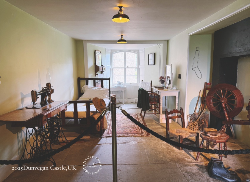 這一間展示的是城堡中「僕役/工作人員的生活空間」,陳設相當樸實。房內可看到縫紉機、紡紗輪、簡單的床鋪與桌椅,呈現過去在城堡裡工作的女性與僕役日常起居與勞動的樣貌。和樓上族長與家族使用的房間相比,這裡更強調實用性,也讓人直觀感受到城堡「樓上與樓下」截然不同的生活世界。