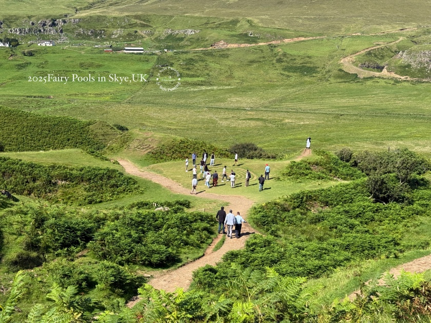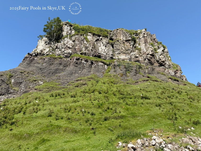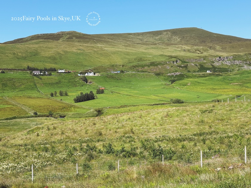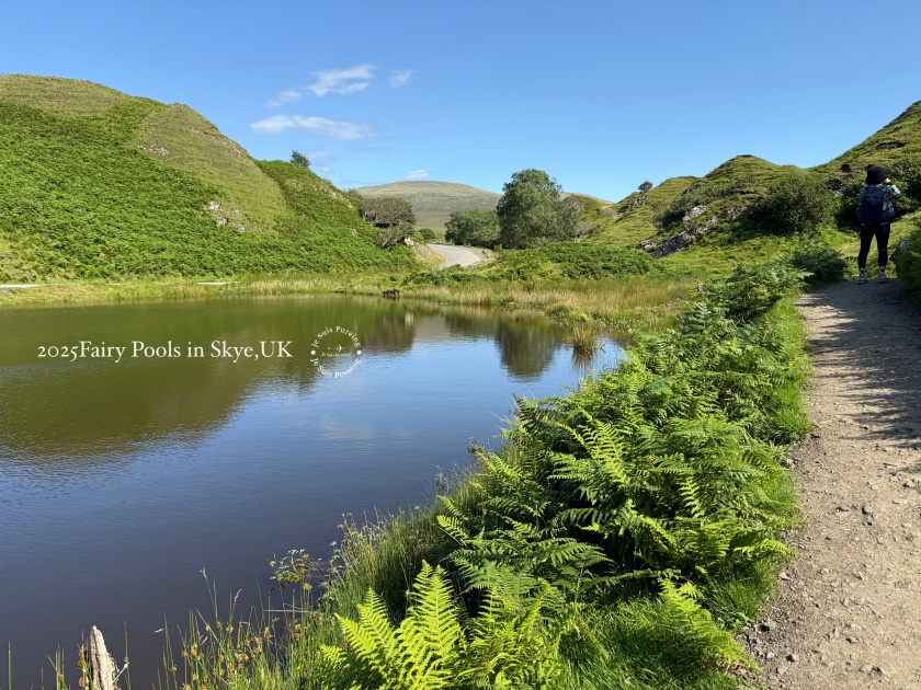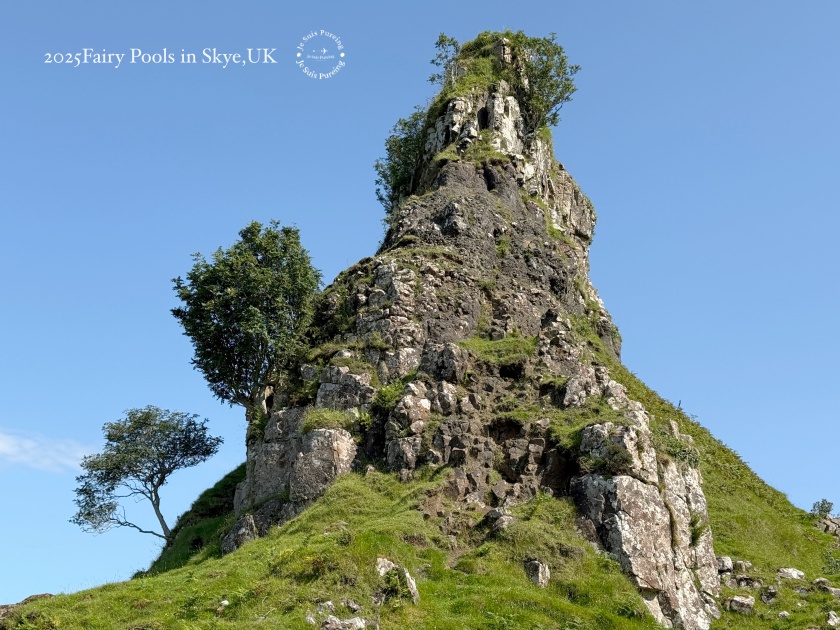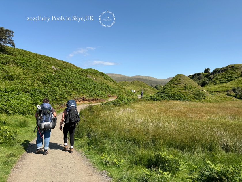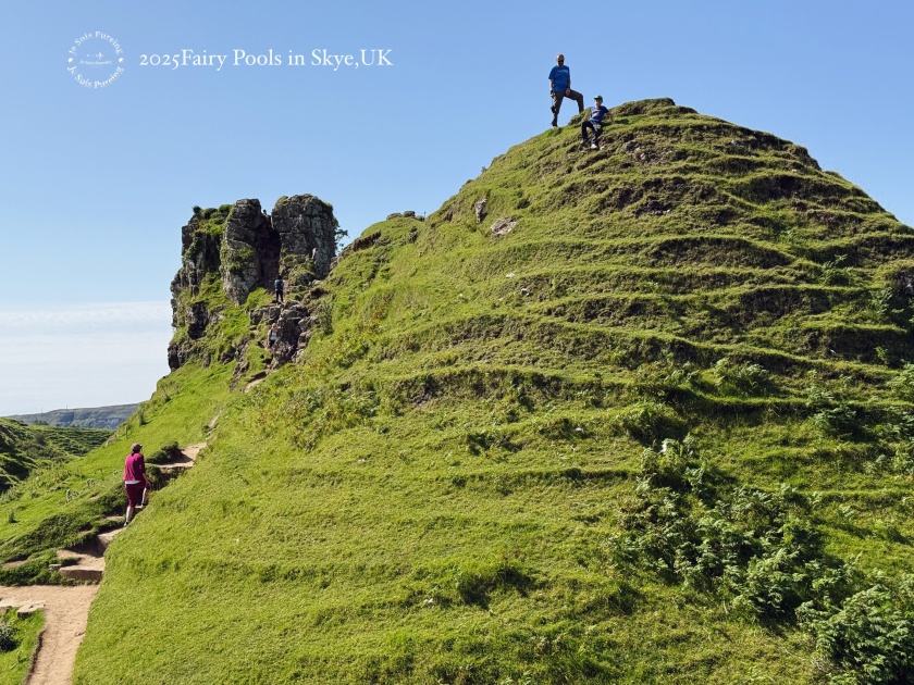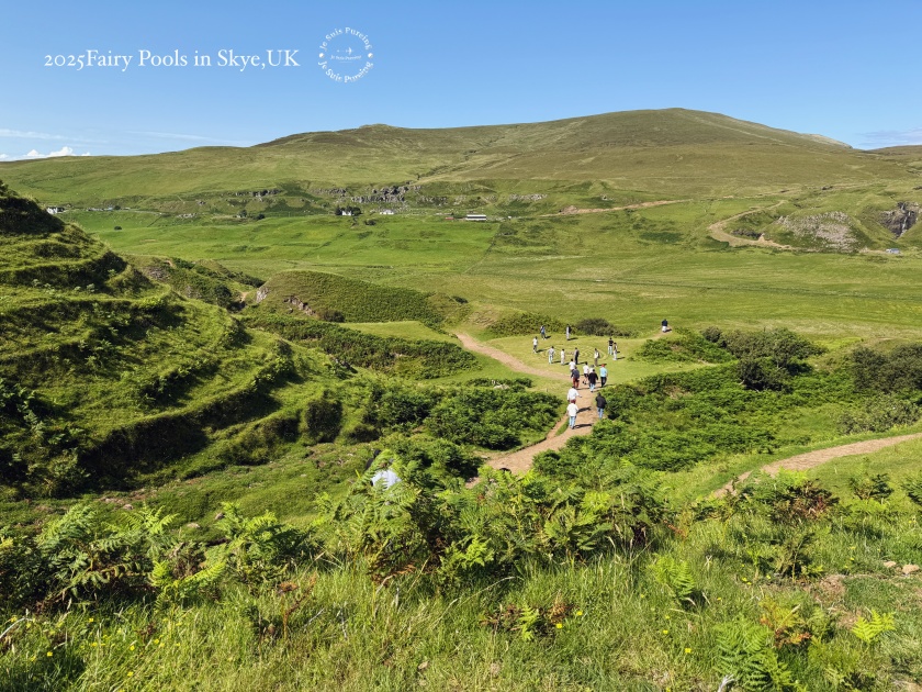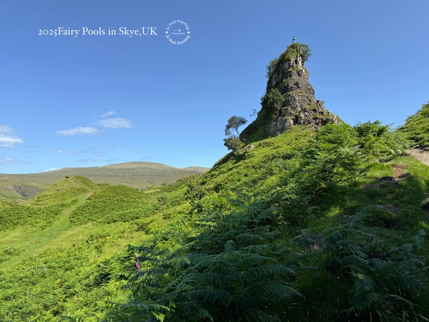 夏季的蘇格蘭天空島午後,熱浪來襲,陽光格外明亮,氣溫隨之上升,雲影在丘陵之間快速移動,整座島嶼的景色也隨著日照顯得更加鮮明。這一天一早七點便搭上巴士出發,先前往老人岩(The Old Man of Storr)健行;中午過後,再度搭車繞行特羅特尼什半島,以一種放慢節奏的方式,透過車窗欣賞夏日天空島的風景。結束上午較具挑戰性的行程後,我沒有再安排高強度健行,而是選擇前往島嶼西北方的 Fairy Glen,作為這天健行活動的完結篇。