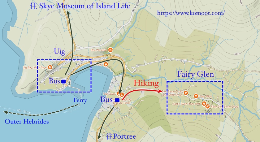 我在 Uig 港灣小鎮休息了大約一個多小時後,便開始步行前往 Fairy Glen。途中會經過幾間民宿,若是自駕遊客,其實也可以考慮在這一帶住宿;鎮上另有一間小型超市與餐廳,補給與用餐都算方便。以大眾運輸來說,Uig 是斯凱島北部主要的巴士路線起迄點之一,班次相對集中,最晚的車班約到下午六點多,只要事先查好時刻表,行程安排上並不困難。