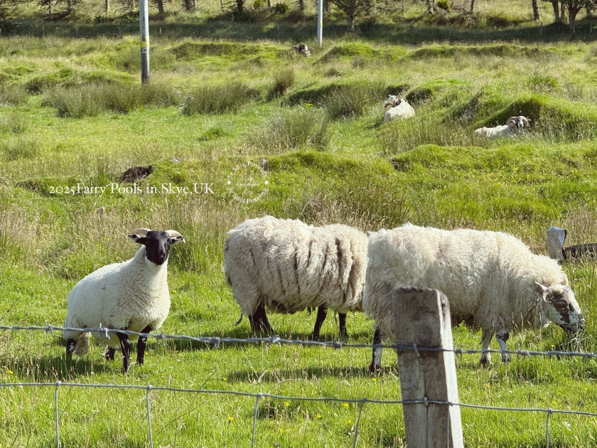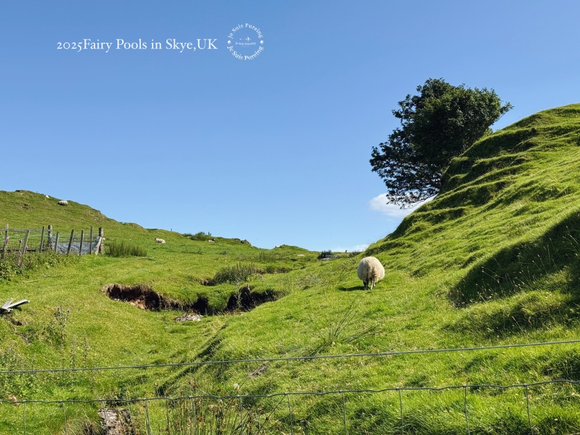 沿著通往 Fairy Glen 的道路前行,這一段對非自駕的遊客來說,是一段必須用腳慢慢走完的距離。沒有汽車行駛過時,只剩下腳步聲、風聲,還有牛羊啃食草地景象。放牧的牛與羊散落在道路兩側的草坡上,對路旁行人的出現似乎早已習以為常,偶爾抬頭望一眼,便又低頭繼續吃草。