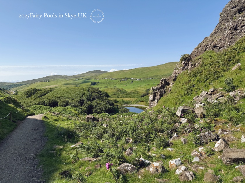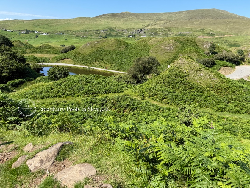 離開主要道路 A87 後,沿著指標方向一路往上走,隨著高度增加,港灣小鎮的景色逐漸展開,視野相當開闊。只是那天健行進入後半段時,體力明顯受到天氣影響;清晨出發時氣溫還算舒適,到了午後卻愈來愈熱。加上通往 Fairy Glen 的道路僅能單線通行,自駕車輛來往頻繁,行人往往得貼著山壁或站到路旁的溝渠邊讓車先過,若遇到雙向會車,更顯得狹窄不便。也正因如此,不難感受到這個規模不大的景點,在夏季究竟有多受歡迎。