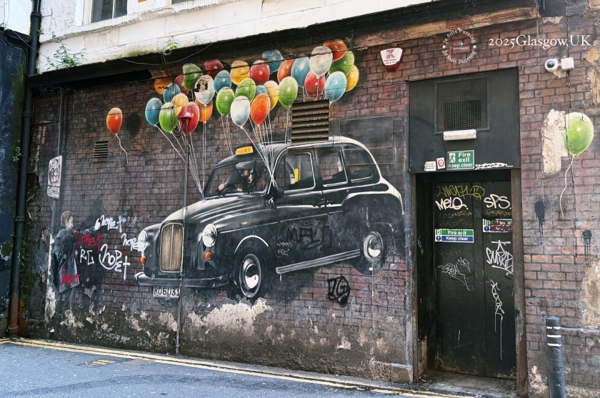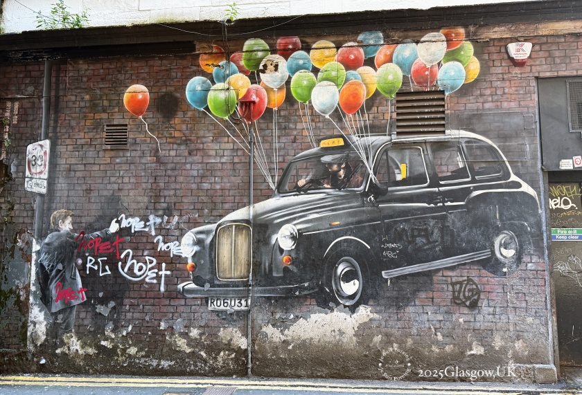 格拉斯哥的計程車會漂浮嗎?這幅壁畫由藝術家 Rogue-One 創作,作品中對細節的高度講究,讓它成為格拉斯哥街頭藝術中不容錯過的一站。乍看之下或許會讓人產生錯覺,彷彿畫面中的計程車違反了重力,也正是這種視覺巧思,讓人忍不住停下腳步細看。