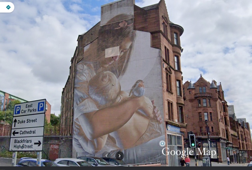 藝術家 Smug 另一件讓人印象深刻的作品,剛好和 High Street 上那幅現代版的聖蒙哥(St Mungo) 形成呼應。這面壁畫用當代的方式重新說了一次格拉斯哥的建城故事,畫的是聖伊諾克(St Thenue/St Enoch) 抱著她心愛的兒子聖肯提根/聖蒙哥(St Kentigern/St Mungo) 的畫面。