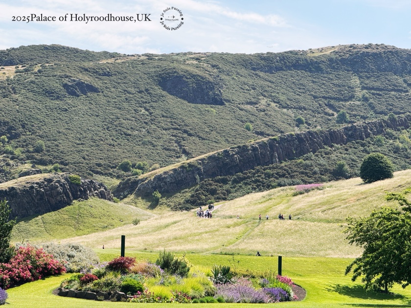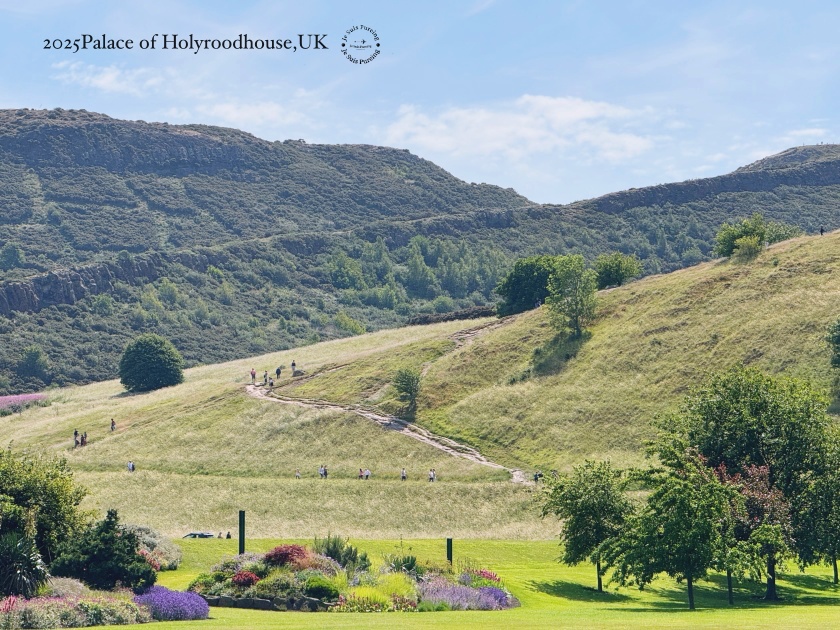 花園後方就是荷里路德公園與亞瑟王座,我們參觀時正好看到不少遊客沿著步道往上攀登,遠遠望去,登山步道上零星移動的人影,在寬廣的草坡與岩壁之間顯得特別醒目,也讓人真切感受到這座王室花園與自然地景之間,幾乎沒有界線的連結感。