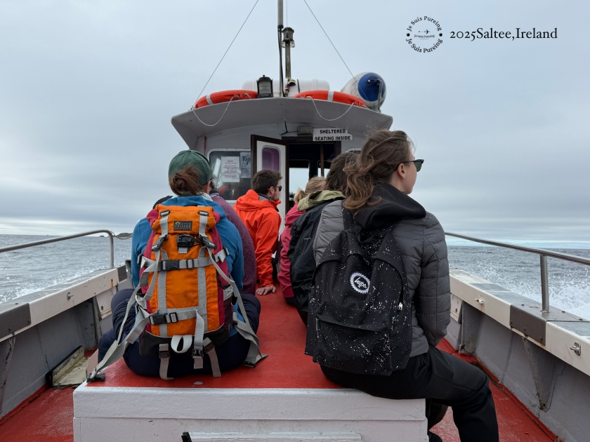 一早的天氣雲層偏厚,陽光幾乎被完全擋住,海面顏色顯得灰藍而平靜。風浪不算大,但船速並不慢,引擎聲穩定地推著我們往外海前進。回頭望去,愛爾蘭本島的輪廓一點一點退後;往前看,Saltee 小島則慢慢從海平線中浮現,距離感在移動中變得越來越清楚。