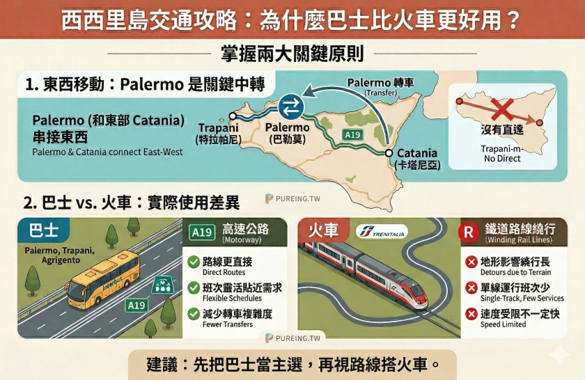 | Palermo ↔ Trapani | 🚌 巴士完勝 | 約 1 小時 45 分,一小時一班車 | 約 3 ~4 小時(需要轉車) | 巴士走高速公路,火車路線彎繞 |