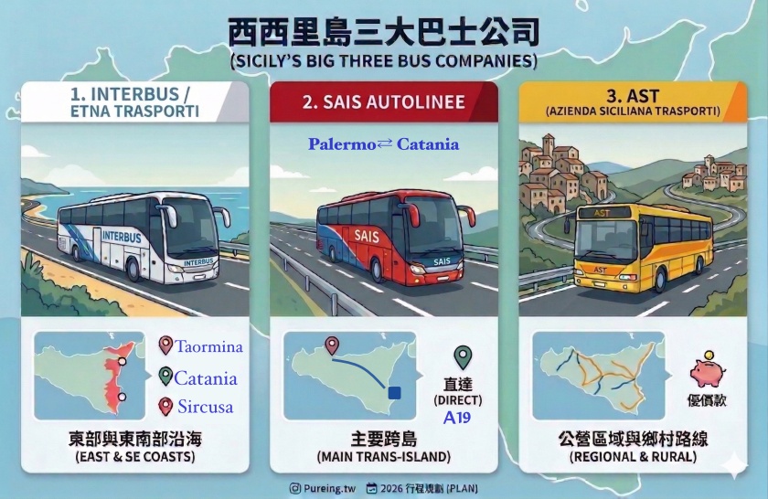 | 核心城市 | Palermo、Catania、Messina | 路線起迄點/主要轉運中心 | 幾乎所有往內陸或小鎮的巴士,都會從這些城市出發或經過 |