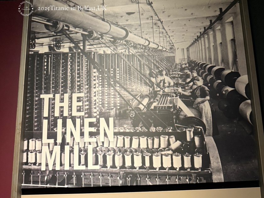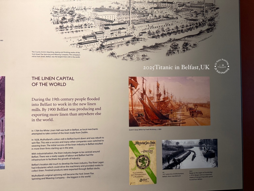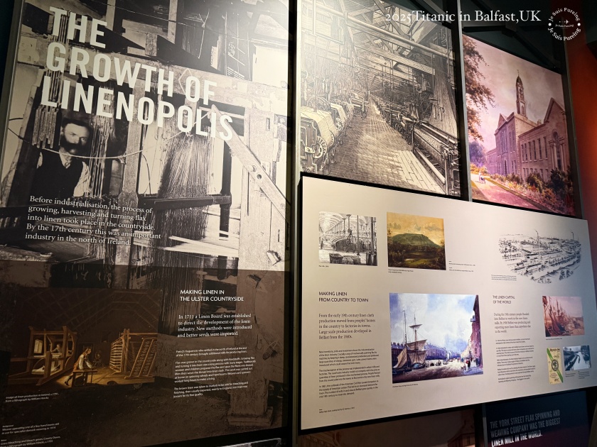 在造船業崛起之前,貝爾法斯特早已因亞麻工業而快速成長,並被稱為「亞麻之都(Linenopolis)」。展區透過展示看板,說明亞麻生產如何從鄉村的手工業,逐步轉變為高度集中機械化的城市工廠體系。到了 1900 年,貝爾法斯特所生產與出口的亞麻布數量,已超過世界上任何一座城市,奠定其作為全球亞麻製品重鎮的地位。