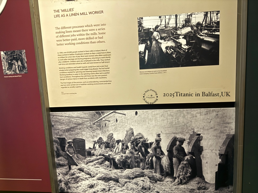 其中特別提到被稱為 「Millies」 的亞麻廠工人,多為女性與孩童。她們長時間在潮濕、高噪音且充滿亞麻粉塵的環境中工作,健康風險高,卻仍是支撐整個產業運作的核心勞動力。這些工人的日常,不只是工業生產的一環,也深刻影響了貝爾法斯特的社會結構與城市生活節奏。