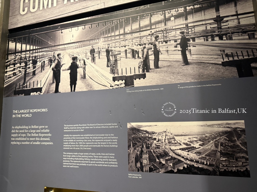 這一區想傳達的訊息是:貝爾法斯特並不是靠單一產業撐起來的城市,而是由亞麻、繩索、食品、工程與機械製造等多條產業鏈交織而成。正是這種完整而成熟的工業基礎,讓後來像鐵達尼號這樣的巨型工程,能在這座城市中被視為「可以實現的計畫」,而非遙不可及的想像。
