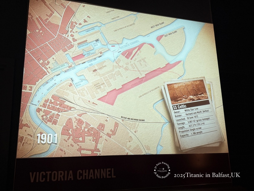 這張 1901 年的港口地圖呈現了維多利亞航道(Victoria Channel)的形成與擴建成果。透過持續疏浚拉根河(River Lagan)並重新規劃水道,貝爾法斯特港得以容納吃水更深、體型更大的船舶。展板旁特別標示了白星航運的 SS Celtic,說明在鐵達尼號誕生之前,港口已具備迎接大型遠洋郵輪的條件,實際上是巨艦得以從貝爾法斯特啟航的關鍵基礎。