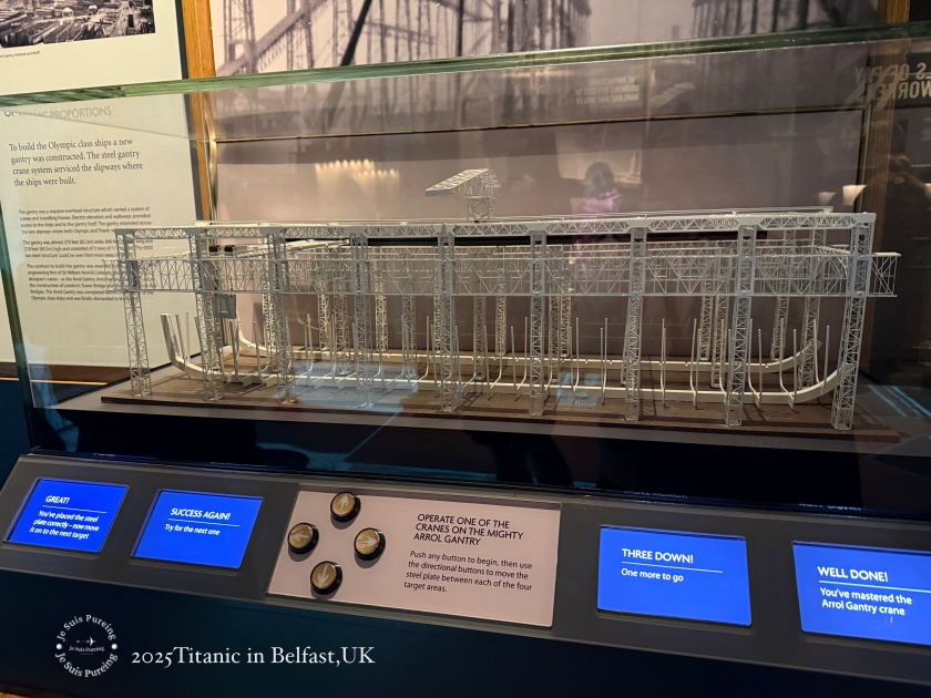 這座模型展示為建造奧林匹克級郵輪而設計的 Arrol Gantry 起重機架,為了應付巨型船體,造船廠拆除舊船台、改建為大型新船台,並架設這座橫跨船台的鋼鐵結構。起重機架負責吊運鋼板與大型零件,讓工人能在不同高度同時施工,是奧林匹克號與鐵達尼號同步建造的關鍵設備。