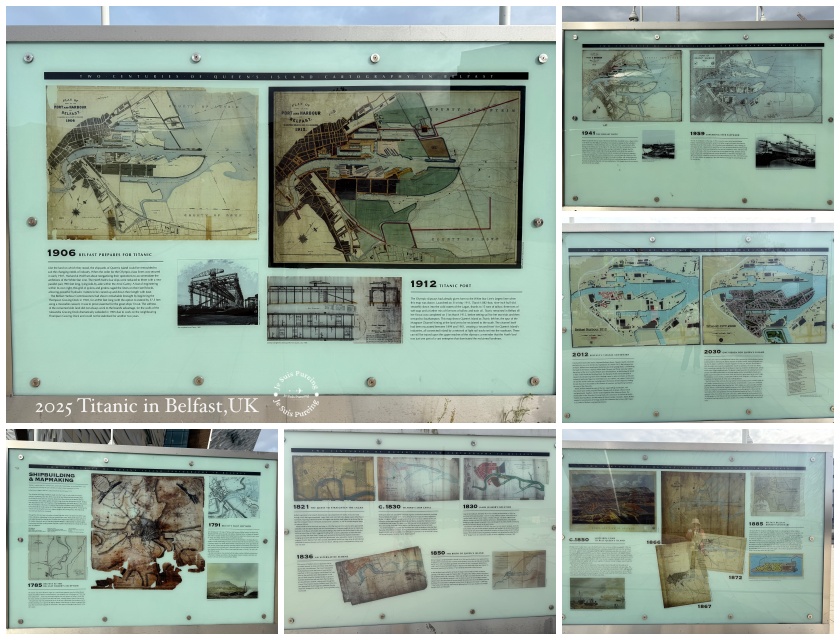 在進入鐵達尼號紀念館之前,有一組戶外展示看版以歷史地圖與影像,呈現貝爾法斯特(Belfast)皇后島(Queen’s Island)兩百多年來的地貌變化與工業發展歷程。從河口淤泥到世界級造船基地,再到今日的鐵達尼區,這片土地的形狀與用途,始終隨著時代需求不斷被重新塑造。