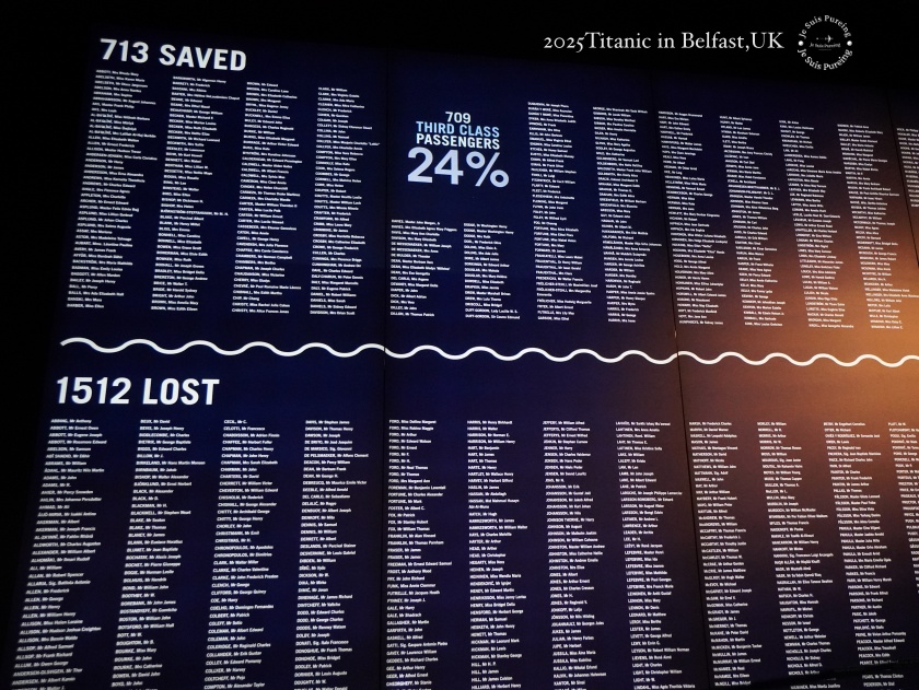 牆面中央標示著「Third Class Passengers 24%」三等艙乘客生還率只有 24 %,清楚呈現出鐵達尼號沉沒時的現實,艙等、位置與出身,深深影響了生存的機會。這不是解釋事故的展牆,而是一面讓人直視結果的牆。當名字多到無法一一讀完時,留下的只是一種沉默的重量。