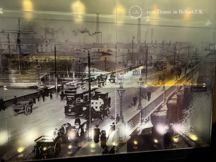 當時的貝爾法斯特,是英國最重要的工業城市之一。造船、紡織、工程製造在這裡高度集中,大量勞工湧入港口周邊,城市規模與基礎設施迅速擴張。整個展示區透過當時的照片、模型與圖像資料,具體呈現港區、船塢、工廠與工人生活的樣貌,讓人理解鐵達尼號並非偶然出現,而是建立在一整套成熟的工業體系之上。