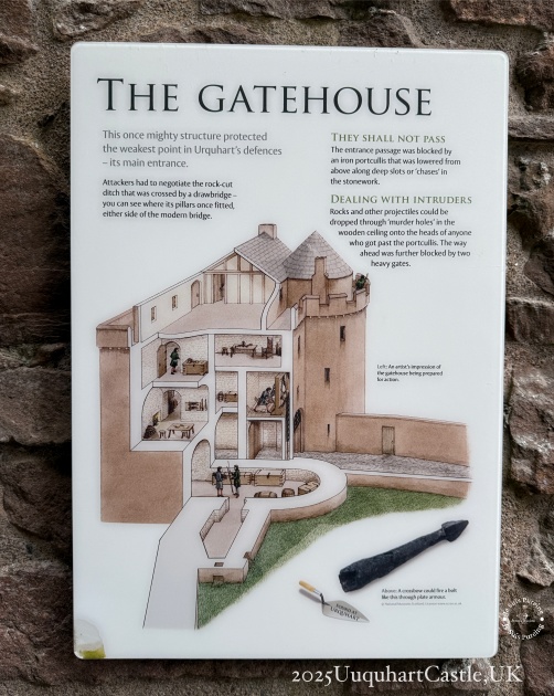 • 照片中是厄克特城堡的門樓(Gatehouse)解說牌,透過剖面示意圖說明城堡最重要、同時也是最脆弱的防禦入口。解說指出,進攻者必須先跨越鑿岩而成的護城壕,通過原本設有吊橋的入口,接著面對由上方放下的鐵柵門與厚重城門。即使突破第一道防線,守軍仍可從天花板的「殺人孔」(murder holes)投擲石塊或其他物品進行反擊。