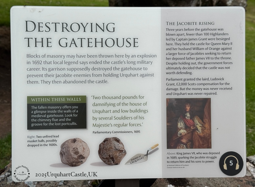 眼前這堆殘破的主門樓,並非自然風化的結果,而是人為爆破所留下的痕跡。1692 年,為了防止城堡落入支持斯圖亞特王朝的雅各黨人(Jacobites) 手中,效忠威廉三世的格蘭特守軍在撤離時於此引爆火藥。門樓原本不只是單純的出入口,而是一套層層設計的防禦機制,用來消耗並阻擋入侵者;然而這次爆破並非戰敗,而是出於戰略考量的自我毀滅。這一刻,也象徵厄克特城堡數百年軍事生命的終結——城堡自此被棄守、不再修復,成為雅各起義動盪局勢下,政治與戰略抉擇所留下的實體證據。