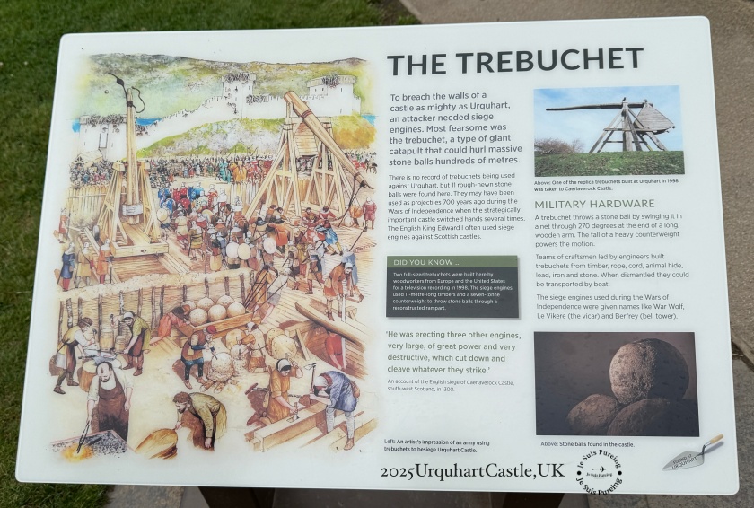 園區內展示的中世紀投石機(Trebuchet),重現了 13–14 世紀圍城戰中最具威力的攻城武器。透過插畫與實體模型,可以直觀想像沉重石彈在反重錘驅動下被拋射而出,用以摧毀城牆、削弱守軍士氣並製造強烈威嚇。雖然史料未明確記載投石機是否曾直接用於厄克特城堡,但現地出土的石彈與相關解說,正好呼應城堡在蘇格蘭獨立戰爭期間反覆遭到圍攻、最終走向廢墟的歷史命運。