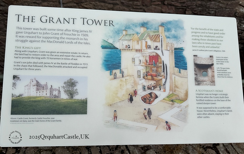 格蘭特塔(Grant Tower)是今日厄克特城堡中最醒目、也保存最完整的建築之一。塔樓建於 1509 年之後,當時蘇格蘭國王詹姆斯四世將城堡交付給約翰.格蘭特(John Grant of Freuchie),作為其支持王權、對抗麥克唐納「島嶼領主」勢力的回報。透過解說圖示,重現 16 世紀塔樓作為貴族居所的空間配置:下層為儲藏與防禦空間,中層是日常起居與宴會場所,上層則可俯瞰尼斯湖,兼具象徵性與實用性。