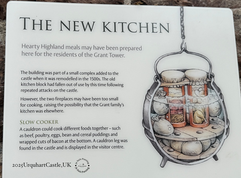 • 新廚房(The New Kitchen)大廚房(The Great Kitchen)介紹的是 16 世紀城堡改建後的飲食空間:在反覆攻擊之下,舊廚房逐漸停用,新的烹飪區域則服務於格蘭特塔的居民。牌文透過插畫與考古發現,還原高地料理的樣貌——從燉鍋慢煮的牛、禽、豆類與穀物,到鹿肉、羊肉、魚類與湖產鮭鱒。這些看似平凡的飲食細節,讓人意識到,在戰爭與權力角力之外,厄克特城堡同時也是一座有人居住、需要日常運作的生活空間。
