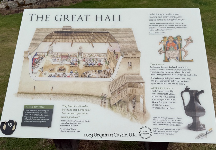 • 厄克特城堡的大廳(Great Hall),在中世紀時期曾是城堡生活與權力展演的核心空間。13 至 14 世紀間,領主在此宴請賓客、舉行儀式與商議要務,音樂、舞蹈與說書交織其間,大廳不只是用餐場所,更是展現財富、地位與政治影響力的舞台。解說牌中描繪了長桌宴席、中央爐火與支撐屋頂的巨大木樑,讓人得以想像當年熱鬧而莊重的場景。隨著戰火頻仍與城堡多次遭到破壞,這座大廳在 15 世紀初被毀並逐漸廢棄,象徵厄克特城堡從權力中心走向衰敗的過程。